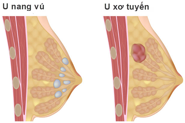 • U xơ tuyến (fibroadenomas). U xơ tuyến là khối u rắn, nhẵn ở vú, không phải ung thư, và dễ dàng xê dịch dưới da khi chạm vào. U xơ tuyến có thể phát triển lớn hơn. Các yếu tố liên quan đến sự phát triển u xơ tuyến bao gồm mang thai, sử dụng liệu pháp hormone hoặc kinh nguyệt.